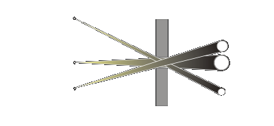 Tloušťka materiálu, ve kterém máme vyrobenou dírku, je posledním faktorem, kterým se budeme zabývat. Určitě ale není posledním, který ovlivňuje výsledný obraz. Destička, ve které je vyvrtaná dírka, by měla být co nejtenší. Je to proto, že paprsky procházející z různých směrů mají v případě tlustého materiálu rozdílnou šířku, kterou může světlo „protéct“. Při focení se nám pak stane, že okraje fotografie jsou tmavší, než její střed. Znázorněno je to na následujícím obrázku, kde máme zvětšený pohled na dírku v desce. Velikost světelných bodů na pravé straně pak znázorňuje, kolik světla otvorem „proteče“. Z toho důvodu opět platí, že čím tenčí materiál, tím lepší.
