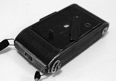 Nyní se podíváme dovnitř fotoaparátu (pro změnu dvířky pro vkládání filmu). V komoře by už neměl být žádný zbytečný díl. Protože dvířka objektivu nejsou světlotěsná (tuto vlastnost měl odstraněný měch), oblepíme vnitřní okraje dvířek a všechna místa, kudy by dovnitř mohlo proudit světlo, nějakou světlonepropustnou látkou. Doporučuju odřezky černé kůže a vteřinové lepidlo – povrch kůže je matný a členitý, takže nehrozí že se od něj bude odrážet svetlo. Zároveň také zkontrolujeme komoru, jestli někde není zarezlá a nebo špinavá.