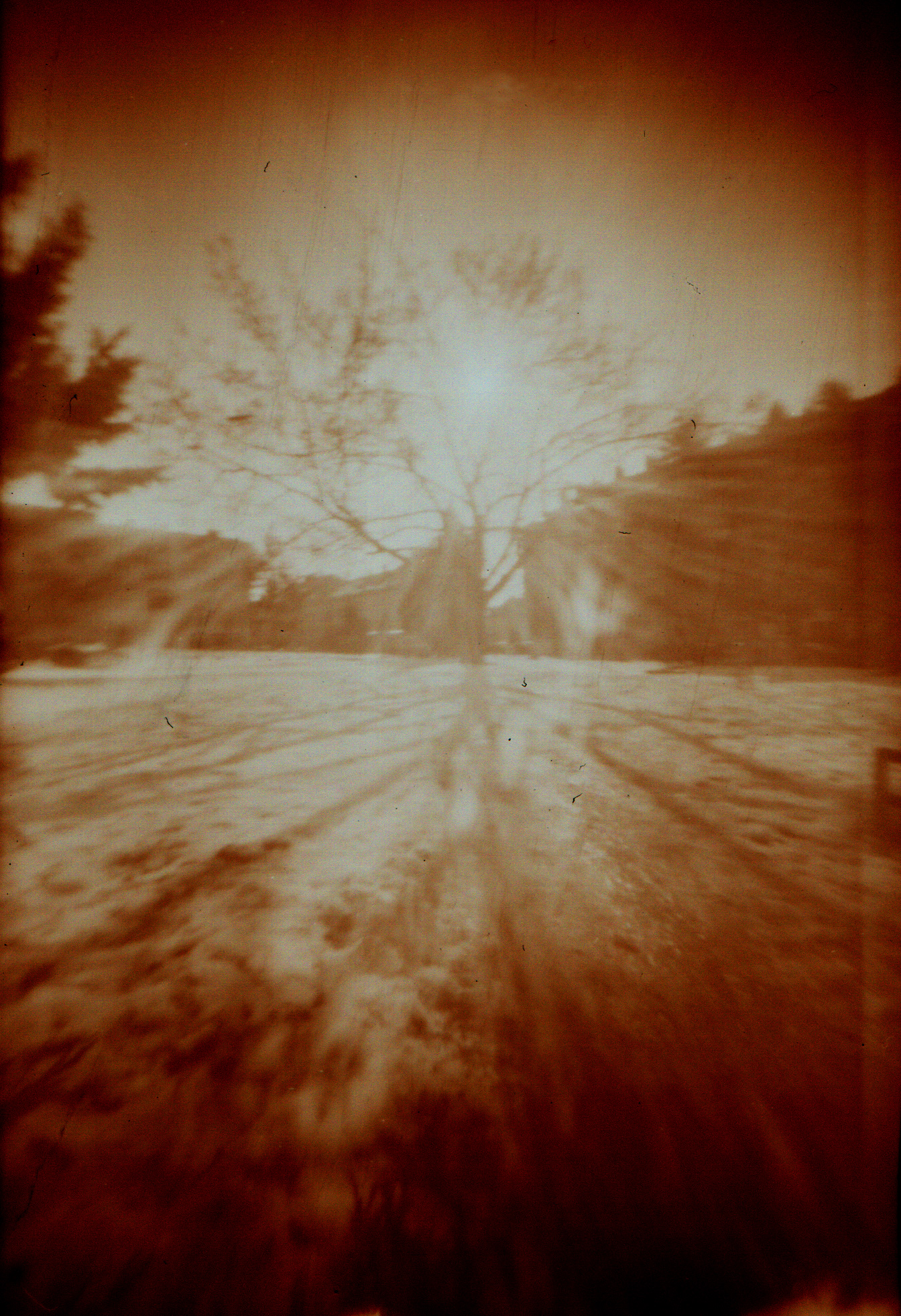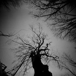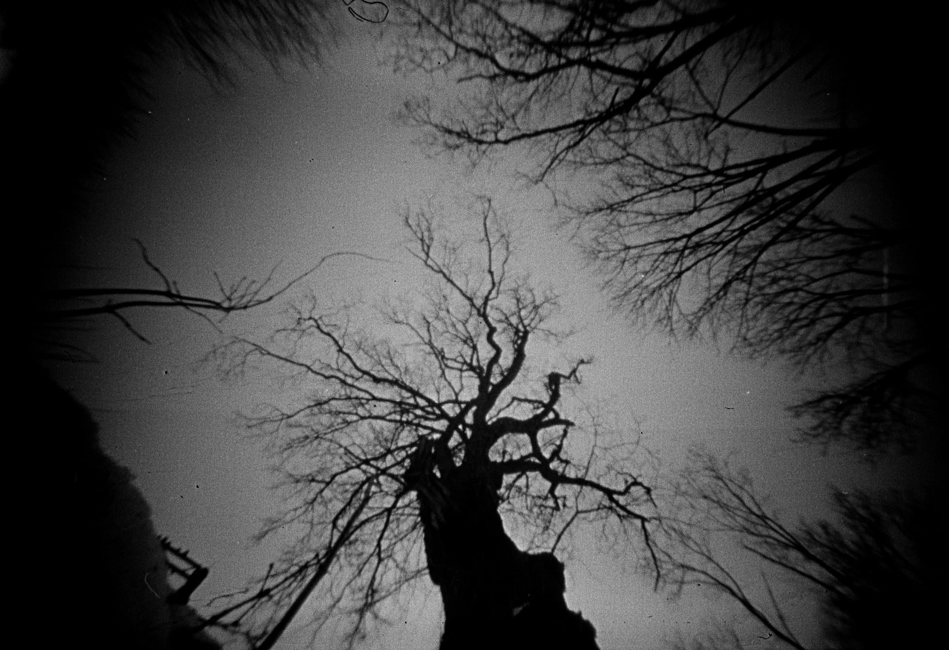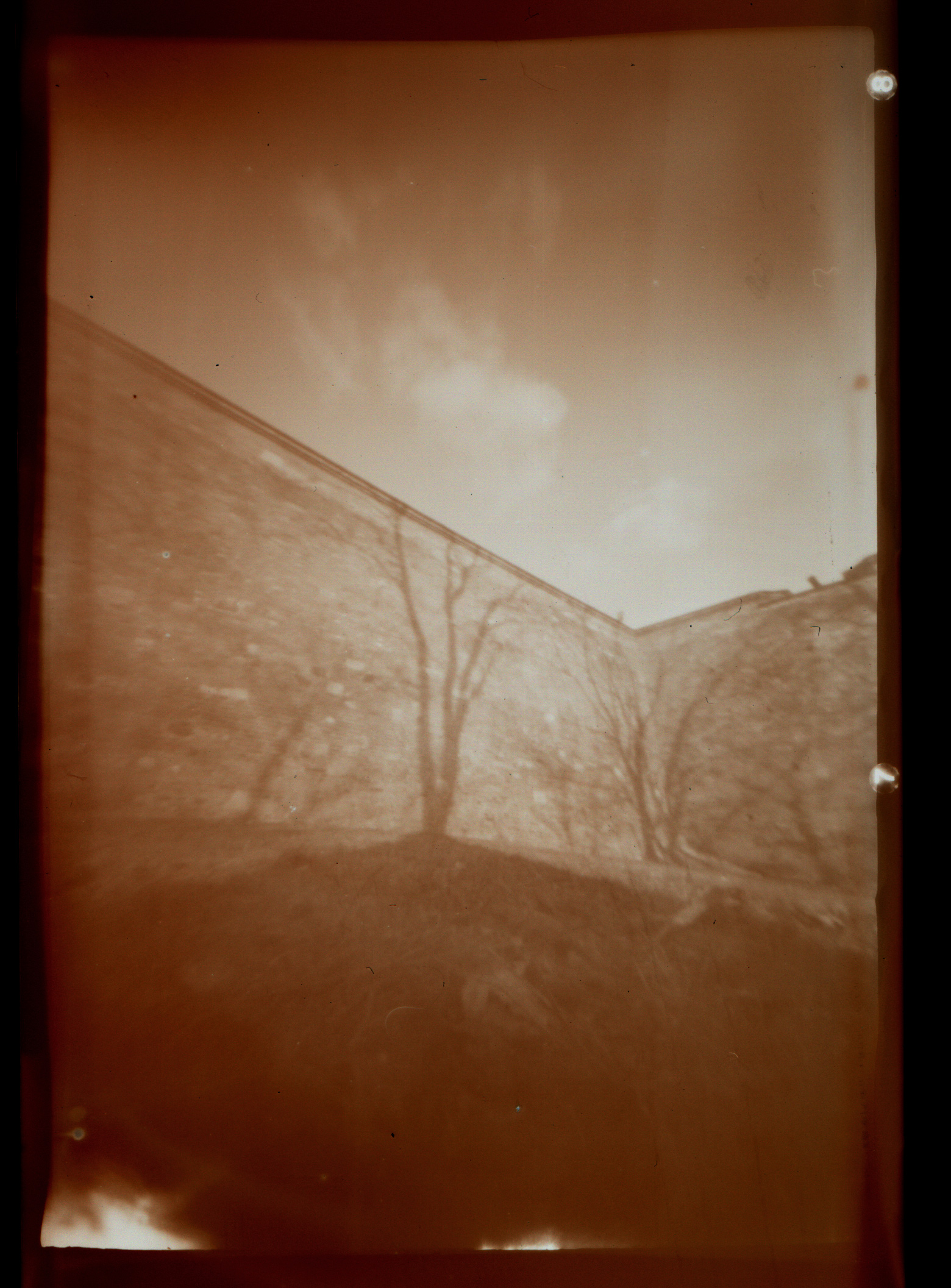Protisvětlo vytváří na fotce světelné šmouhy - odrazy v dírce, jelikož materiál ná nenulovou tloušťku. Fomapan ASA 200, digitalizováno na Canon MP 250.