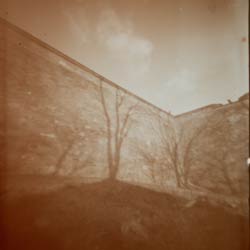 Stíny stromů na hradbách Špilberku. Fomapan ASA 200, digitalizováno na Canon MP 250.